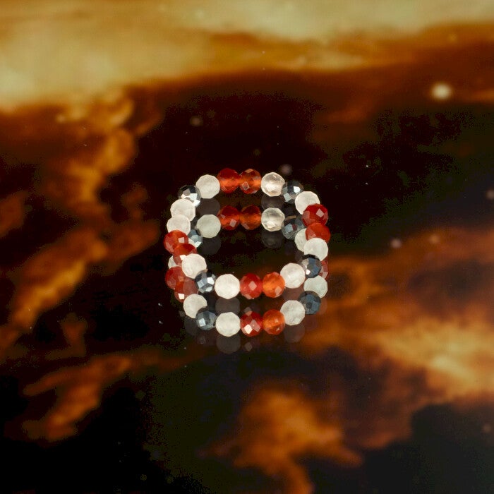Portées ensemble, les bagues forment une déclaration cohérente, symbolisant connexion, dévotion et énergie durable. L’équilibre entre les tons rosés et rouges profonds rend le style romantique sans lourdeur, parfait pour un usage quotidien ou comme cadeau.